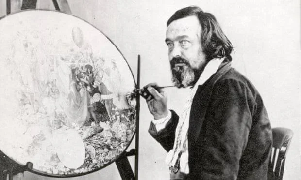 One piece of art that I want to talk about specifically is the incredibly intricate and detailed The Fairy Feller’s Master Stroke which he started work on in 1855. The Tate Britain, where this painting now hangs, explains the scene like this “with the exception of Shakespeare’s Oberon and Titania, who appear in the top half of the picture, the figures are drawn entirely from the artist’s imagination. The main focus of the painting is the Fairy Feller himself, who raises his axe in readiness to split a large chestnut which will be used to construct Queen Mab’s new fairy carriage. In the centre of the picture the white-bearded patriarch raises his right hand, commanding the woodsman not to strike a blow until the signal is given. Meanwhile the rest of the fairy band — figures including, as per the children’s rhyme, ‘soldier, sailor, tinker, tailor, ploughboy, apothecary, thief’ and ranging from tiny gnats and centaurs to a large dragonfly playing a trumpet — surround him, many looking on in anticipation, anxious to see whether the woodsman will succeed in splitting the nut with one stroke” (Roberts, 2024).