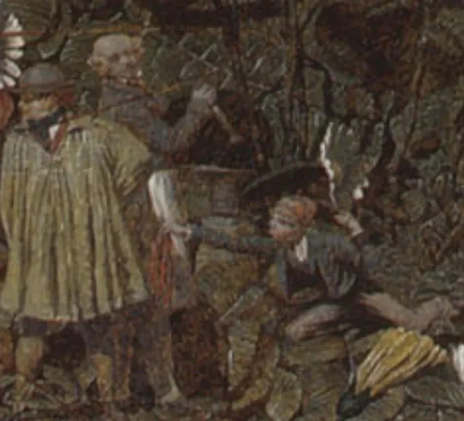 Interestingly, amongst all these characters and the scene going on with the splitting of the chestnut there is something else happening in the painting too. At the top of the scene we see a white haired man holding a pestle over a stone mortar, this is thought to represent Robert Dadd, Dadd’s father. Beside him a young boy, presumably Dadd himself, reaches out for his coat and we see a substance that looks like blood pouring from his fingers. Robert is holding the pestle like a knife ready to cut downwards and some have interpreted the younger boy’s posture as self defence. This may be an indication of how Dadd now saw his father’s murder; an act of self defence against someone he thought was an evil imposter. Dadd worked on this piece until 1864 and even after almost a decade he still considered it unfinished as the bottom left background is still only sketched in. Today, The Fairy Feller’s Master Stroke is considered to be Dadd’s masterpiece.
